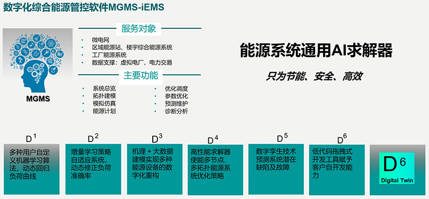 西门子数字化综合能源管控平台(MGMS-iEMS)是西门子基于数字孪生技术打造的用户侧能源生产与使用相结合的多能流综合能源管控系统。依托于机理模型和数据模型,对系统内的分布式能源设备,能源转换设备(公用动力系统),各类负荷,以及储能设备建立起数学模型,通过人工智能(机器学习)的手段,实现对系统的能源预测(负荷预测 / 发电预测),通过数据处理、模型训练、动态预测和策略优化等一系列步骤,完成对系统内各设备的优化调度,参数优化等高级功能,实现优化运行目标。